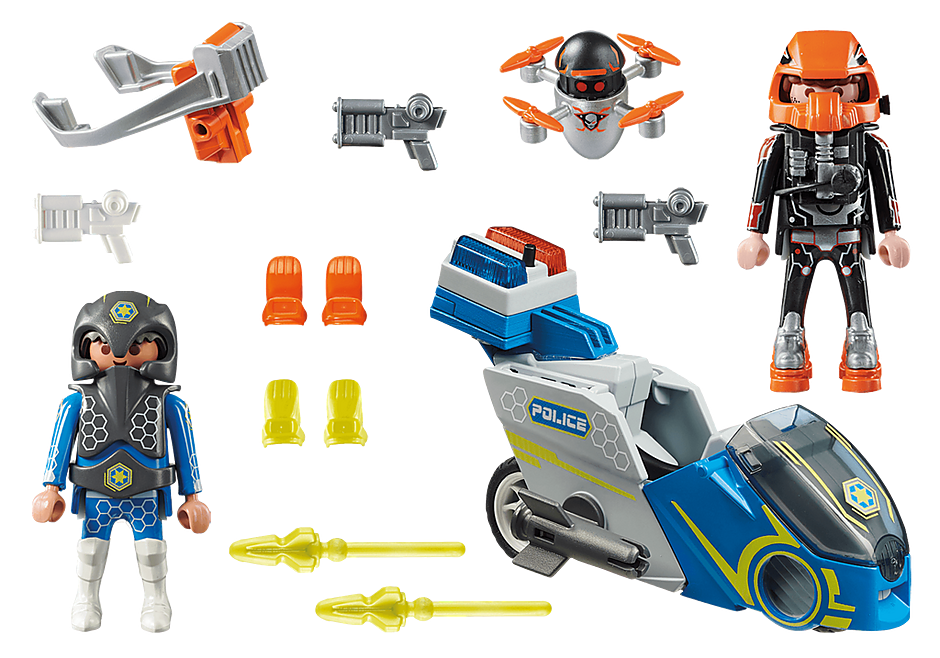 - Accessories: 1 Galaxy Police bike; 2 bullets; 1 drone; 1 jet backpack; 1 pair of jet shoe attachments; 2 guns grey; 1 gun white; 2 helmets; 2 pairs of gloves.