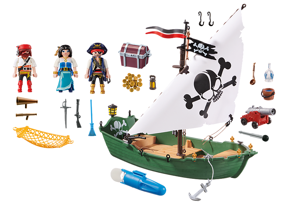 - Accessories: 1 pirate ship, 1 underwater motor, 1 ladle, 1 treasure chest, 1 set of coins, 1 hand lantern, 1 large binoculars, 1 small binoculars, 1 carafe, 1 bucket, 1 cannon with a bullet, 2 hooks, 1 hammock, 1 rifle, 1 epee, 1 pirate hat, 1 pirate cap, 1 hair ornament, 1 broom, 2 bracelets.