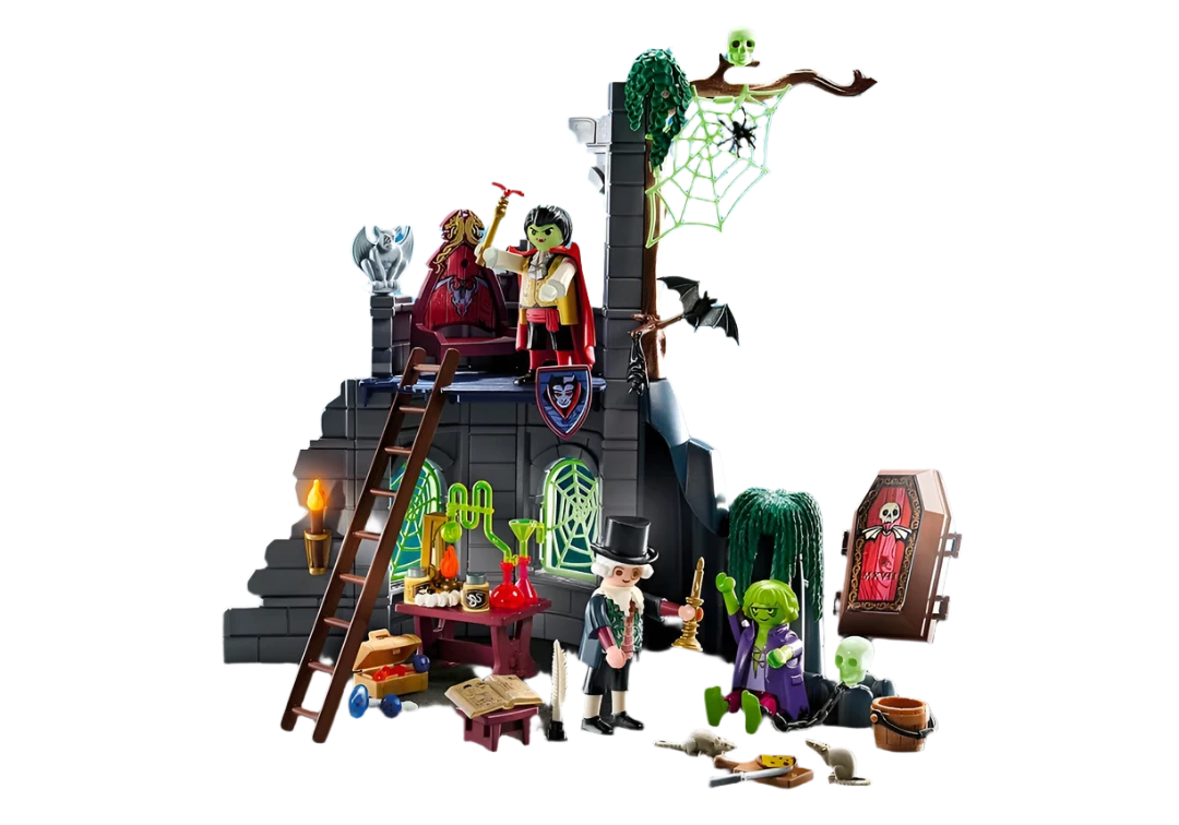 - Accessories: 1 tricorn hat, 1 apron, 1 cape, 1 scroll, 1 stick with attachment for a bat, 8 wall parts, 2 windows with spider web, 1 ladder, 1 tree, 3 hanging plants, 1 spider web, 1 skull, 1 candle, 1 throne, 1 treasure chest, 2 bones, 1 chain with shackle, 1 chopping board, 1 piece of cheese, 1 table, 1 stool, 2 laboratory glasses, 1 distillation glass with holder, 1 oil lamp, 1 quill with holder, 1 book, 1 knife, 3 crystals, 1 "crypt" figure, 1 shield, 2 horns