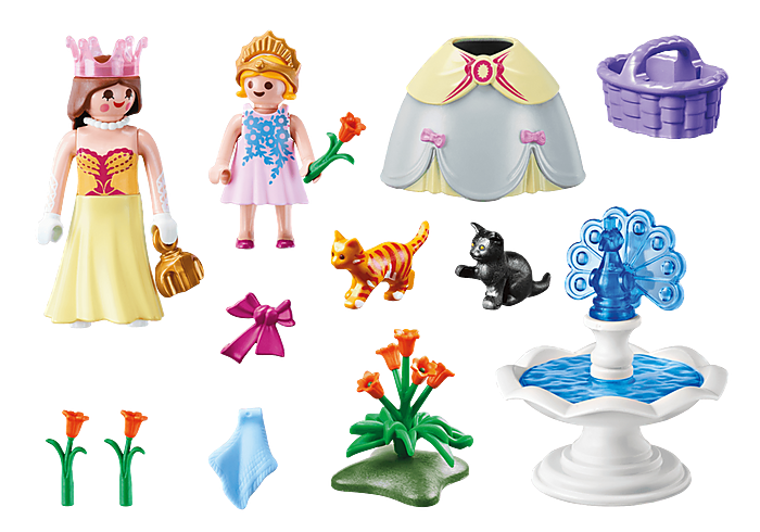 - Figures: 1 woman, 1 girl; Animals: 2 cats; Accessories: 1 fountain with peacock sculpture, 1 flower arrangement, 1 grass area, 1 basket, 1 flask, 1 handkerchief, 1 crown large, 1 crown small, 1 chain.