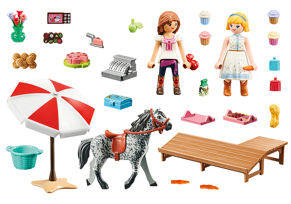 - Accessories: 1 stall, 1 cash register, 1 sun umbrella, 1 western saddle, 1 halter, reins, 1 basket, 4 cupcakes, 1 box of candy, chocolates, 1 cake, 1 cake shovel, 1 pastry snails, 1 tray of cake, 1 tray, 2 tins, 1 bag, 3 carrots, 2 apples, 1 vase, 1 bouquet of flowers, 1 bundle of straw.