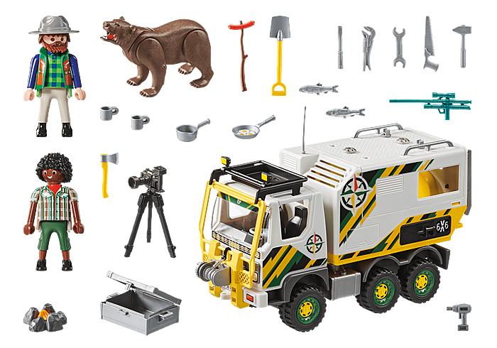 • Accessories: 1 expedition truck, 1 camera with tripod, 1 suitcase, 1 fireplace, 1 spade, 1 axe, 2 cups, 1 pot, 1 pan, 1 set of tools, 1 stick with sausage, 1 anaesthetic rifle, 1 hat.