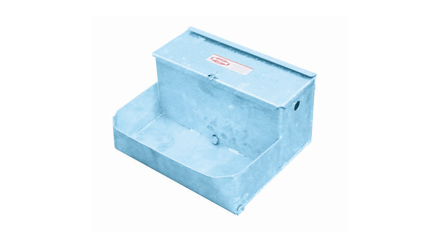 Brass Ball-Valve Fitted Self-contained heavyweight drinker made from steel sheet. Hot Dipped Galvanised after manufacture. Suitable for sows, pigs, sheep or calves. Full width removable lid. Complete with _" brass ball-valve. Two wall fixing holes in back of drinker. 350mm wide, 330mm back to front, 190mm high (trough 100mm deep).