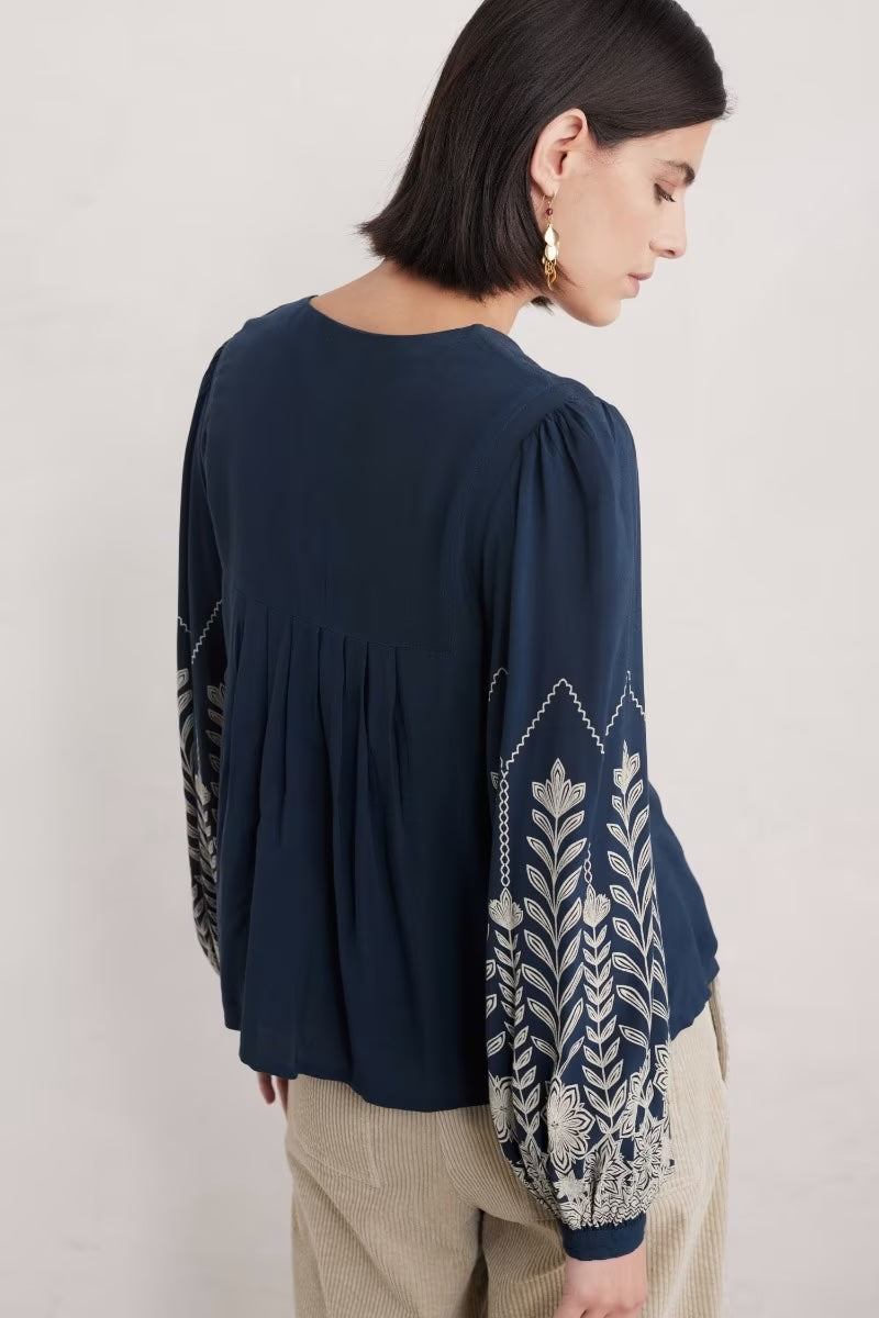 Made with certified viscose, this relaxed fit blouse features statement blouson sleeves and subtle pleats, and it gathers for gentle volume. Perfect for any occasion, dress it up or down with a knitted vest or your favourite jewellery.