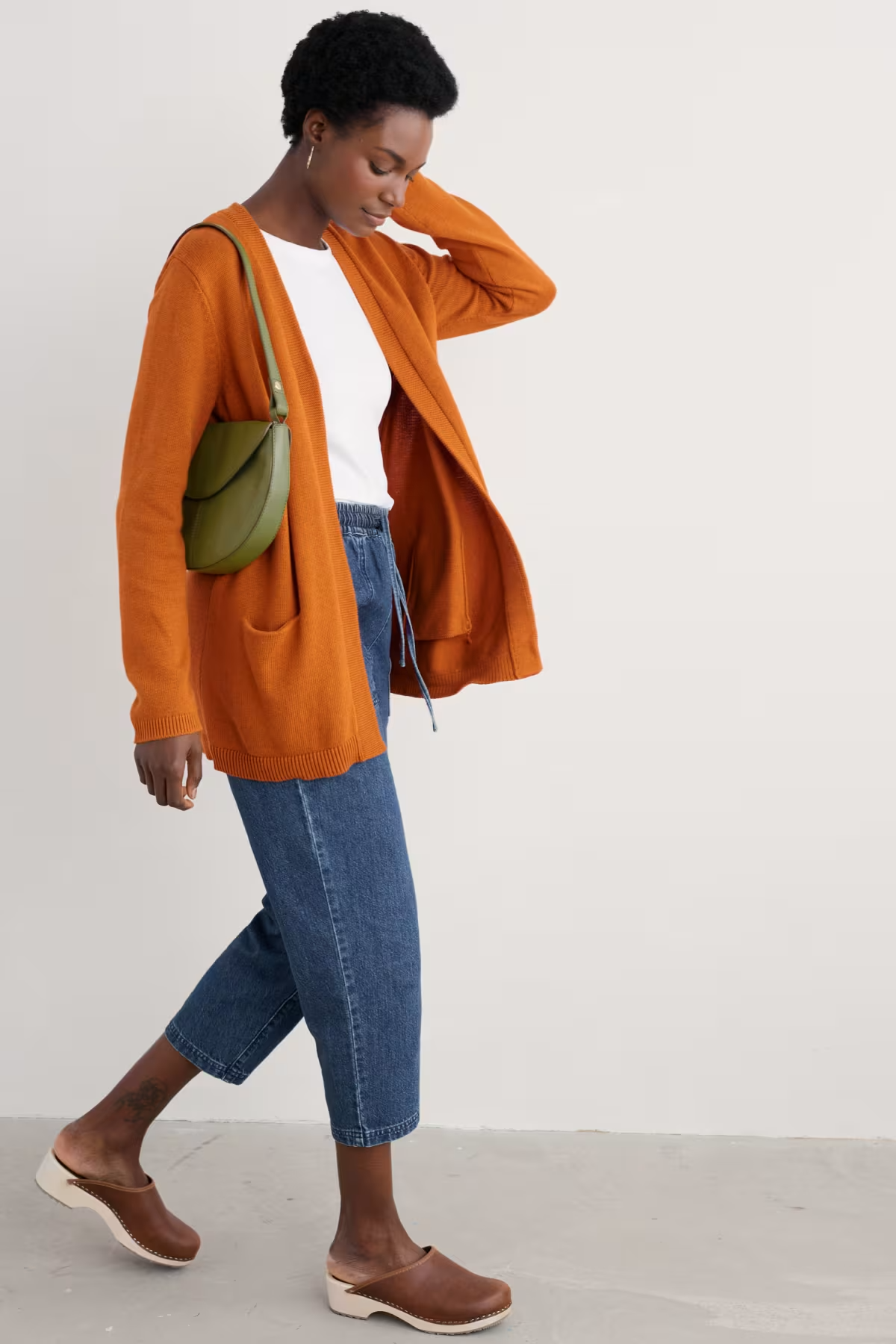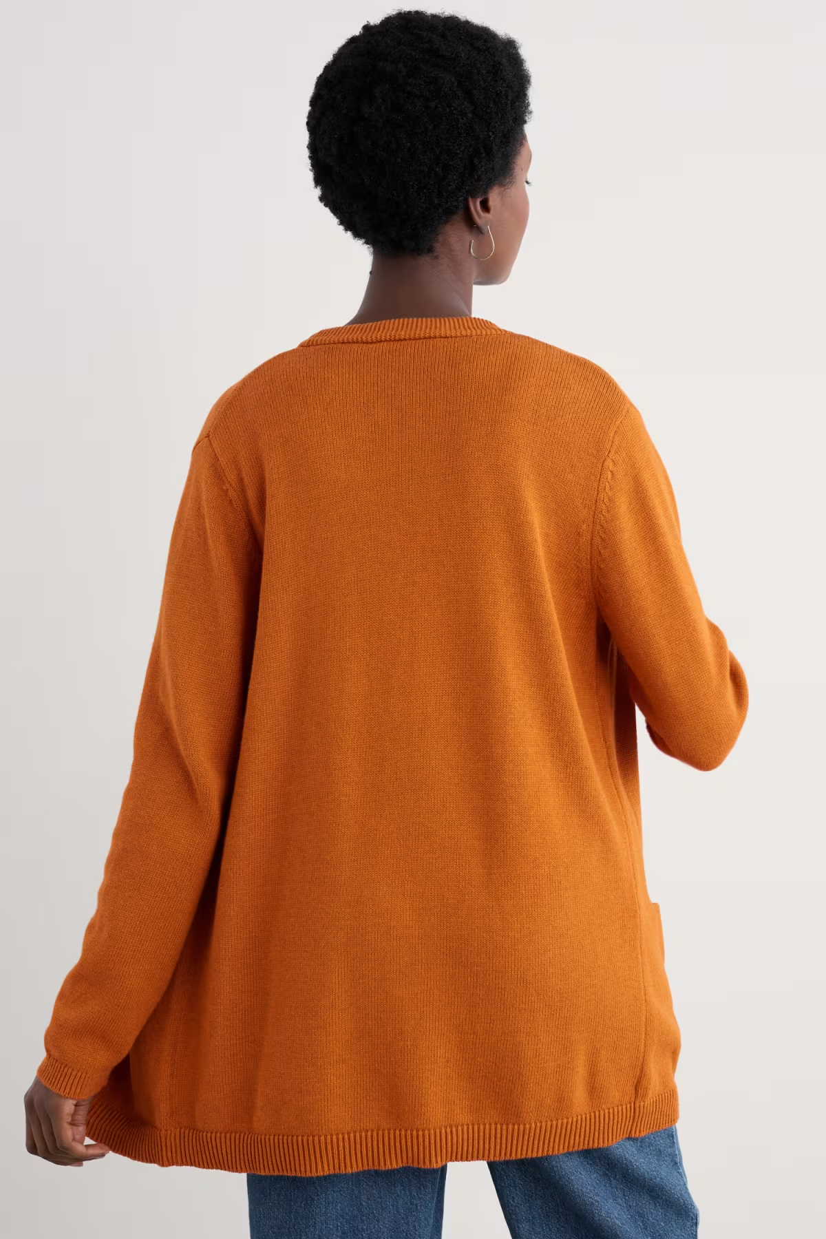 Layer over tapered trousers or a printed dress and enjoy the soft garter stitch neckline, ribbed cuffs and hem, and convenient pockets. A versatile addition to any wardrobe.