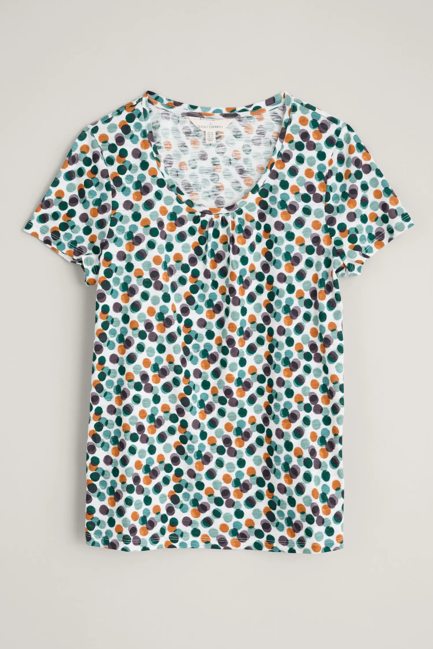 Easy-fitting top with short sleeves and a scoop neck with gentle gathers.
