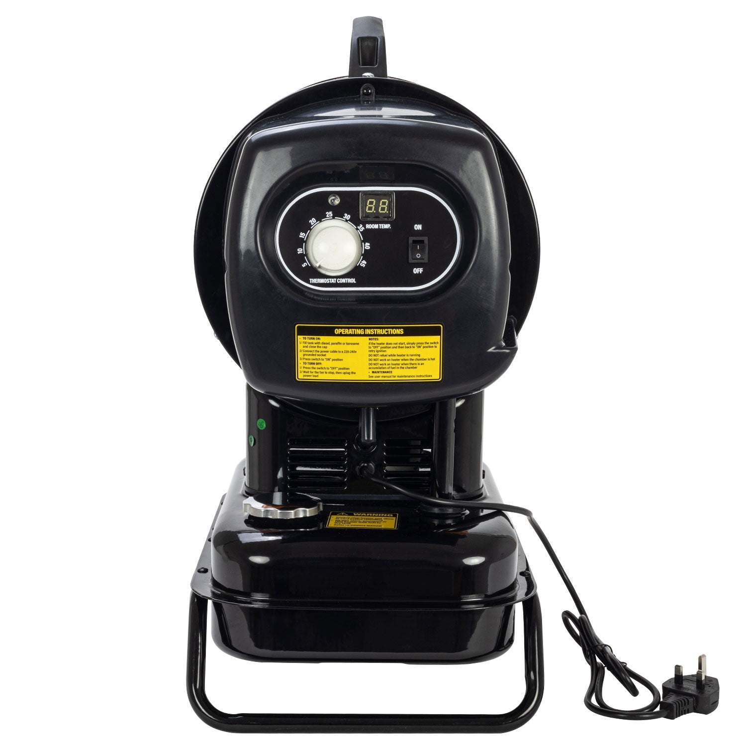 - LED display thermostat for regulating heat output, with adjustable dial to set target temperature. Once target temperature is reached the heat will automatically cut-off.