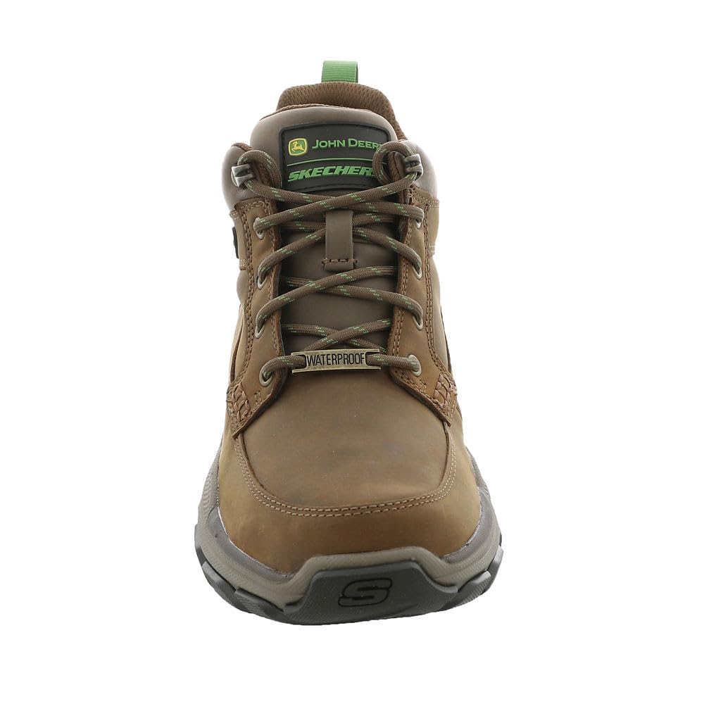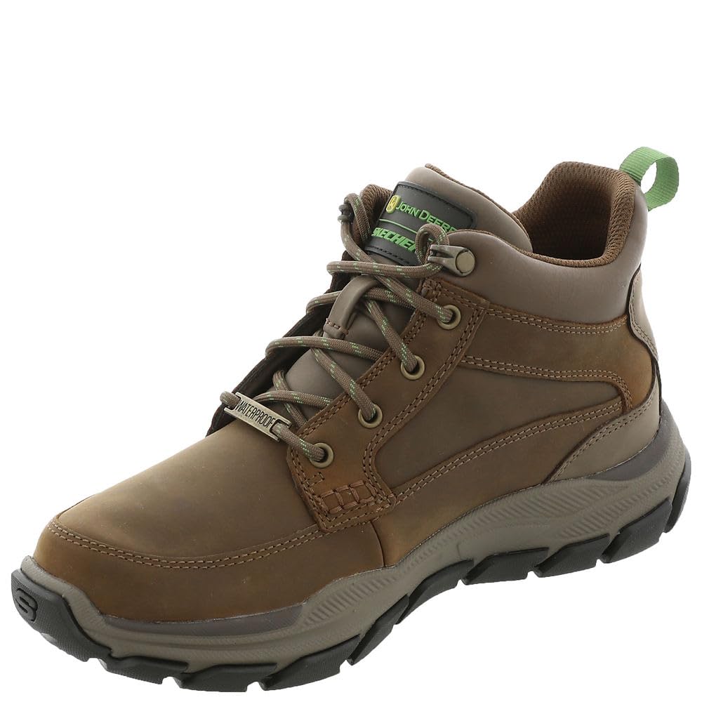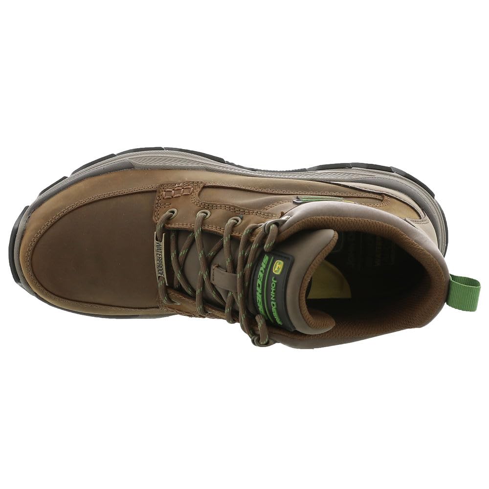 This moc toe, lace-up boot features a waterproof construction and industrial-grade durability in a hiking-inspired silhouette. The Relaxed Fit ensures a roomy, comfortable fit, while the Skechers Air-Cooled Memory Foam insole cushions every step. Whether you're working on-site or off the clock, this mid-top boot is ready to handle whatever your day brings — with the trusted quality of John Deere and Skechers behind every detail.