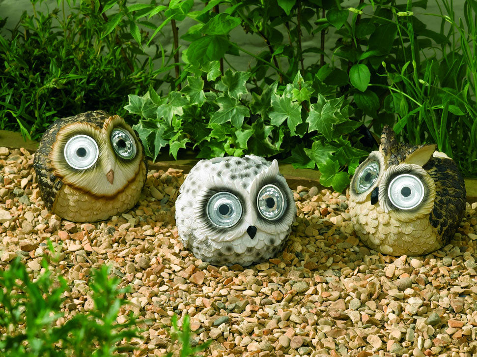 Product Details:- Spotlight eyes automatically illuminate in darkness- Charges in direct sunlight - Up to 8 hours of light each night when fully charged- Powered by an integral solar panel- On/Off switch to control light- 2 white LEDs per owl- No operating costs- Replaceable rechargeable batteries- No wiring, simply place and enjoy