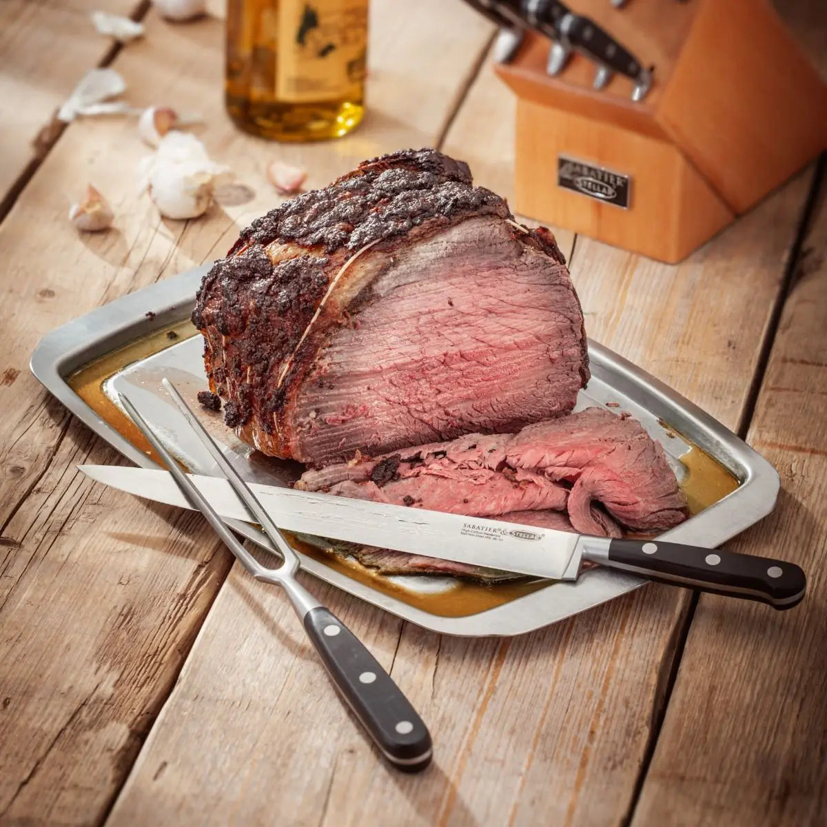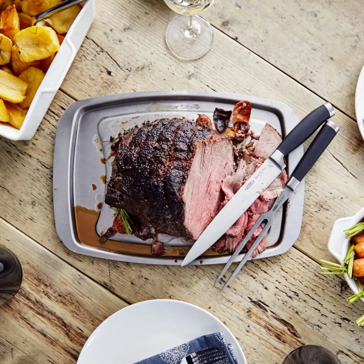 The Stellar Kitchen Spiked Carving Tray measures 38 x 26cm and features a sturdy design with a recessed gutter that effectively channels juices away from your table.