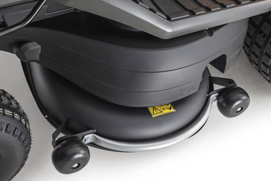 - An infinite-increment hydrostatic drive - adjusted via a foot pedal - optimizes manoeuvrability and makes it easy to work safely around obstacles; while a washing link facilitates the hassle-free removal of corrosive, performance-limiting debris from the underside of the 108cm twin-bladed reinforced cutter-deck.