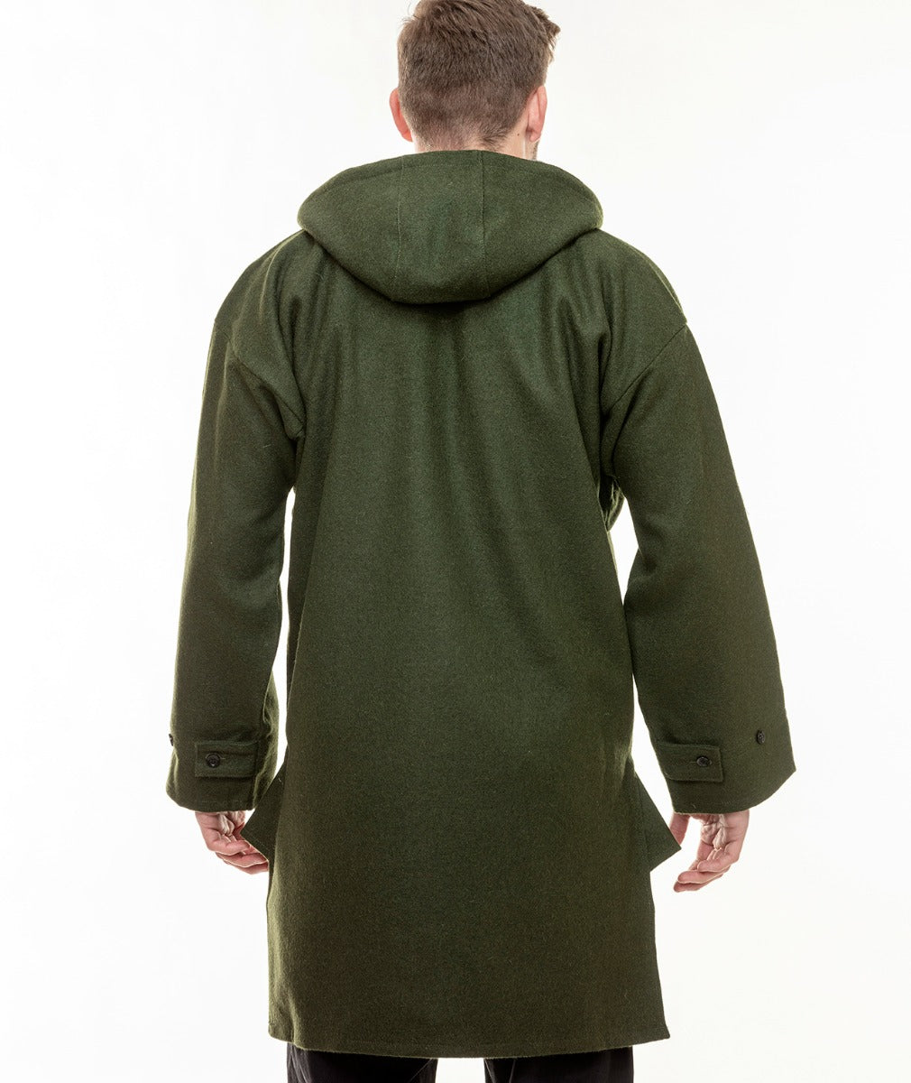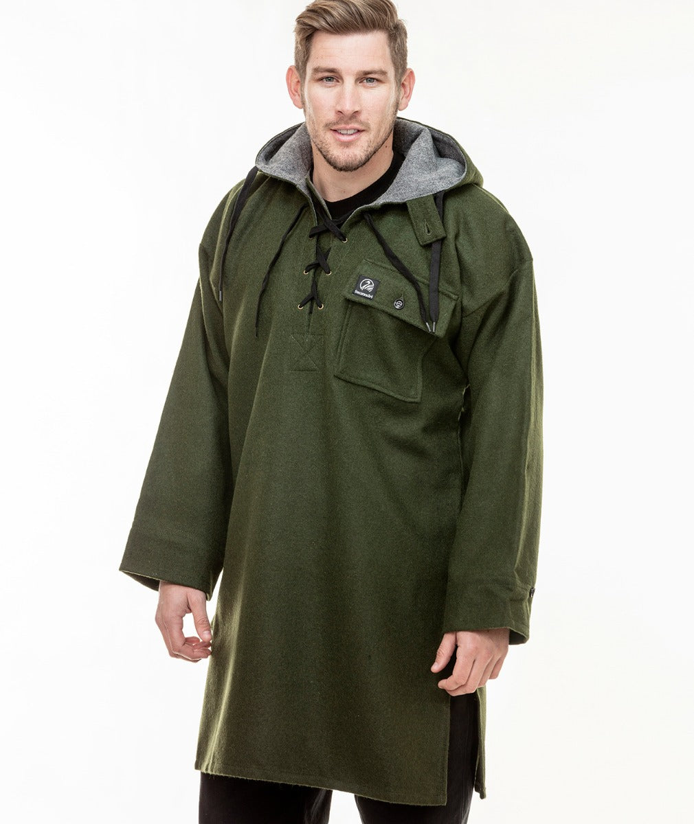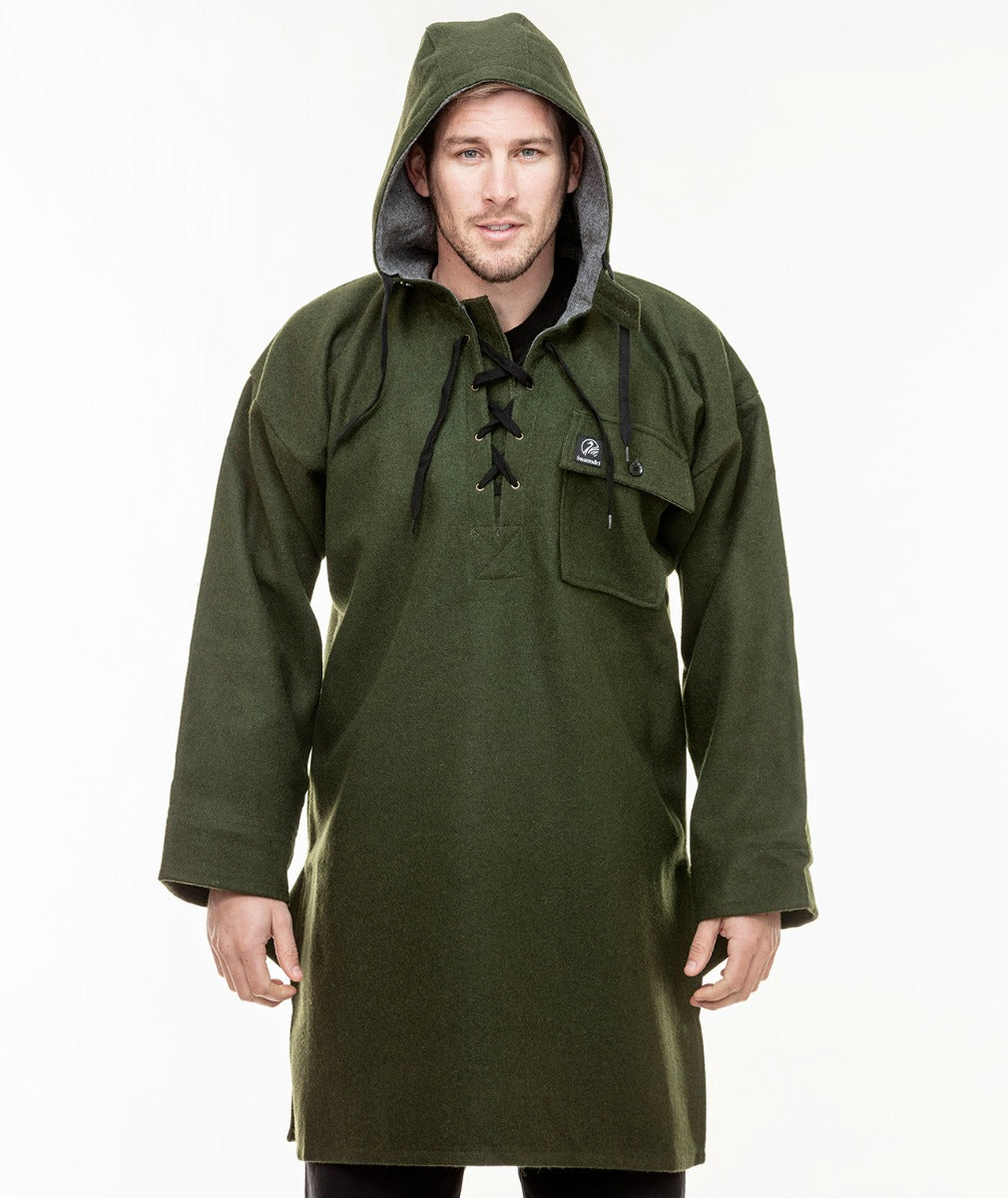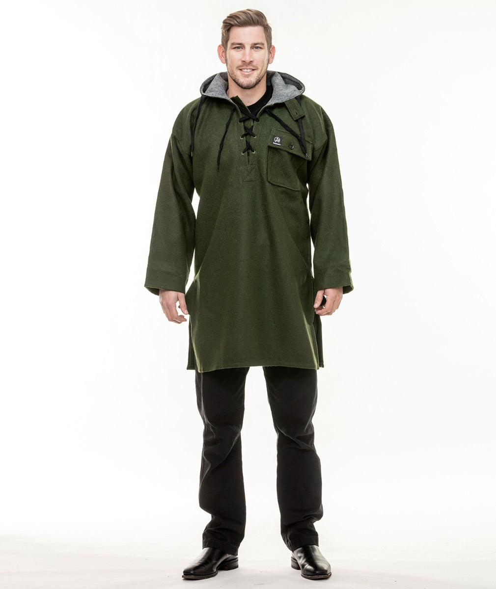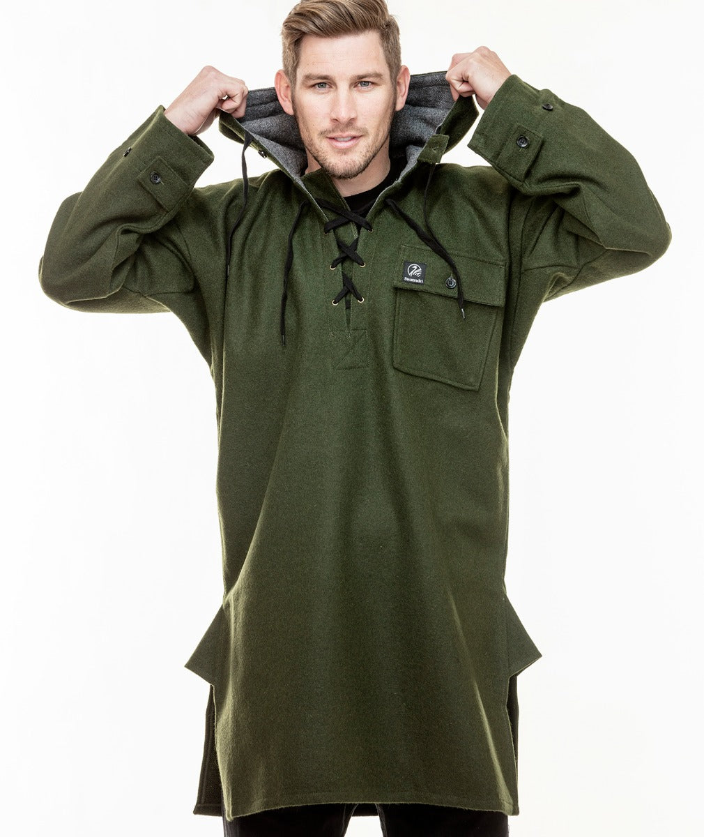 The OG bush shirt is constructed as other traditional garments, using one continuous piece of heavy wool fabric from the front to the back hem, eliminating shoulder seams. It is designed to be very roomy, allowing layers to be worn underneath. It's lined through the body with a loose liner which is softer against the skin. The 3-piece hood has an extra lining panel which reinforces the shaping of the hood and prevents it from peaking at the front for a more secure fit around your face.