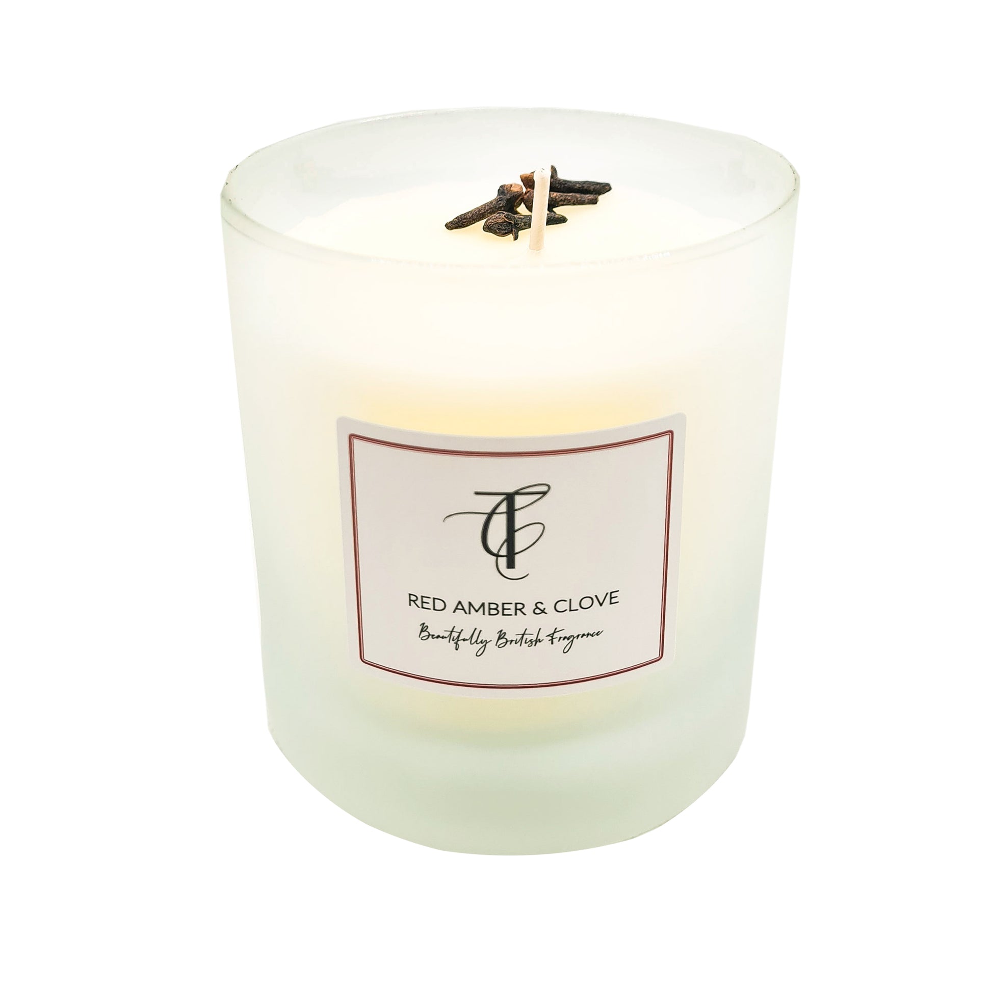 Experience a cozy & indulgent ambiance with The Country Candle Co Red Amber & Clove Pastel Glass Candle. Featuring a unique blend of juicy citrus fruits, smooth cinnamon, spicy clove, rich cream tonka bean, smooth musk, and golden amber, this luxurious scent will fill any room with warmth.