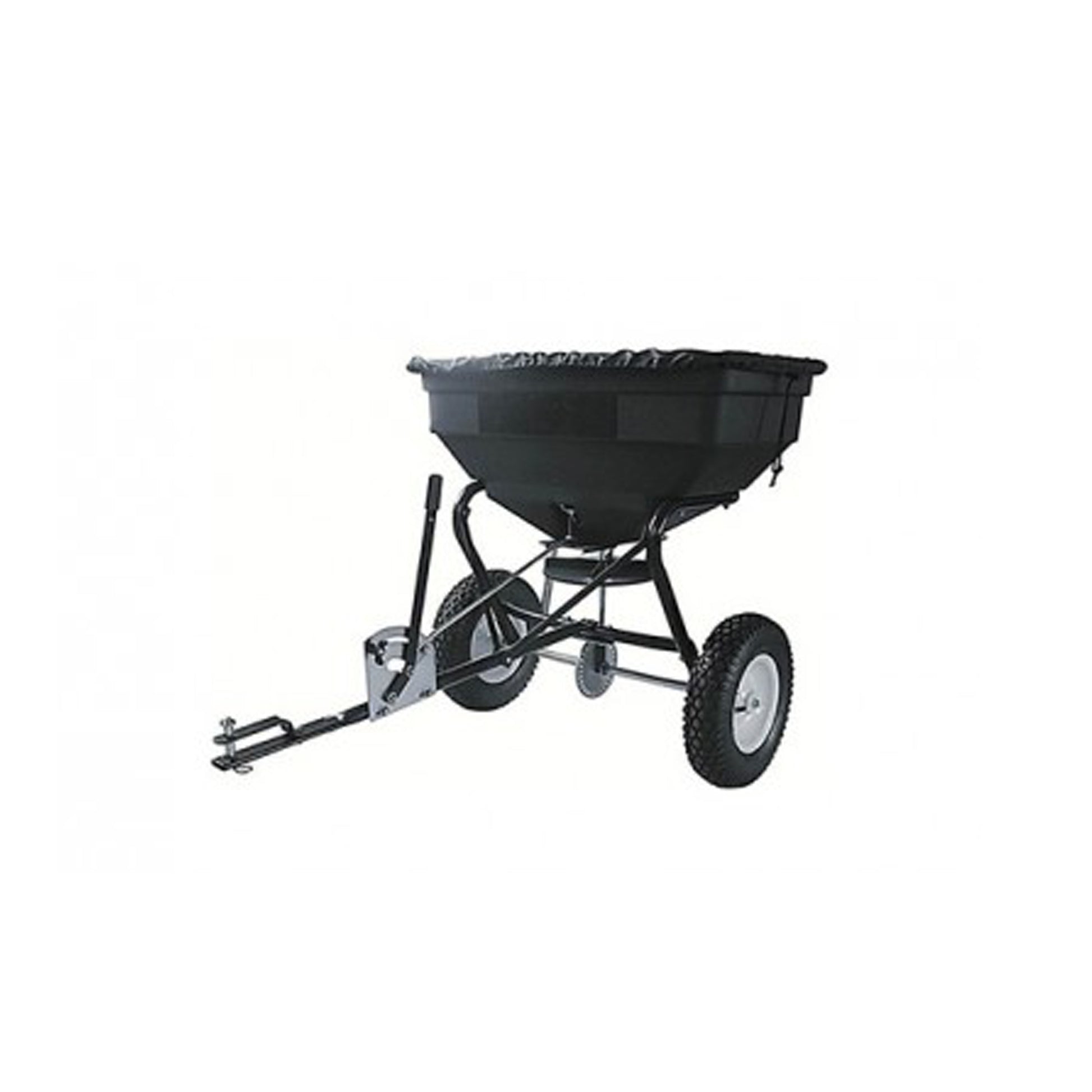 Towed Spreader from Tondu suitable for use with materials up-to 125lb. The spreader is perfect for use with both fertiliser and seed on medium to large areas of land. Further feature include a rust proof poly hopper and spreader plate for increased working life, and a pair of pneumatic tyres allowing the spreader to tow with ease. A rain cover is included for a finishing touch,