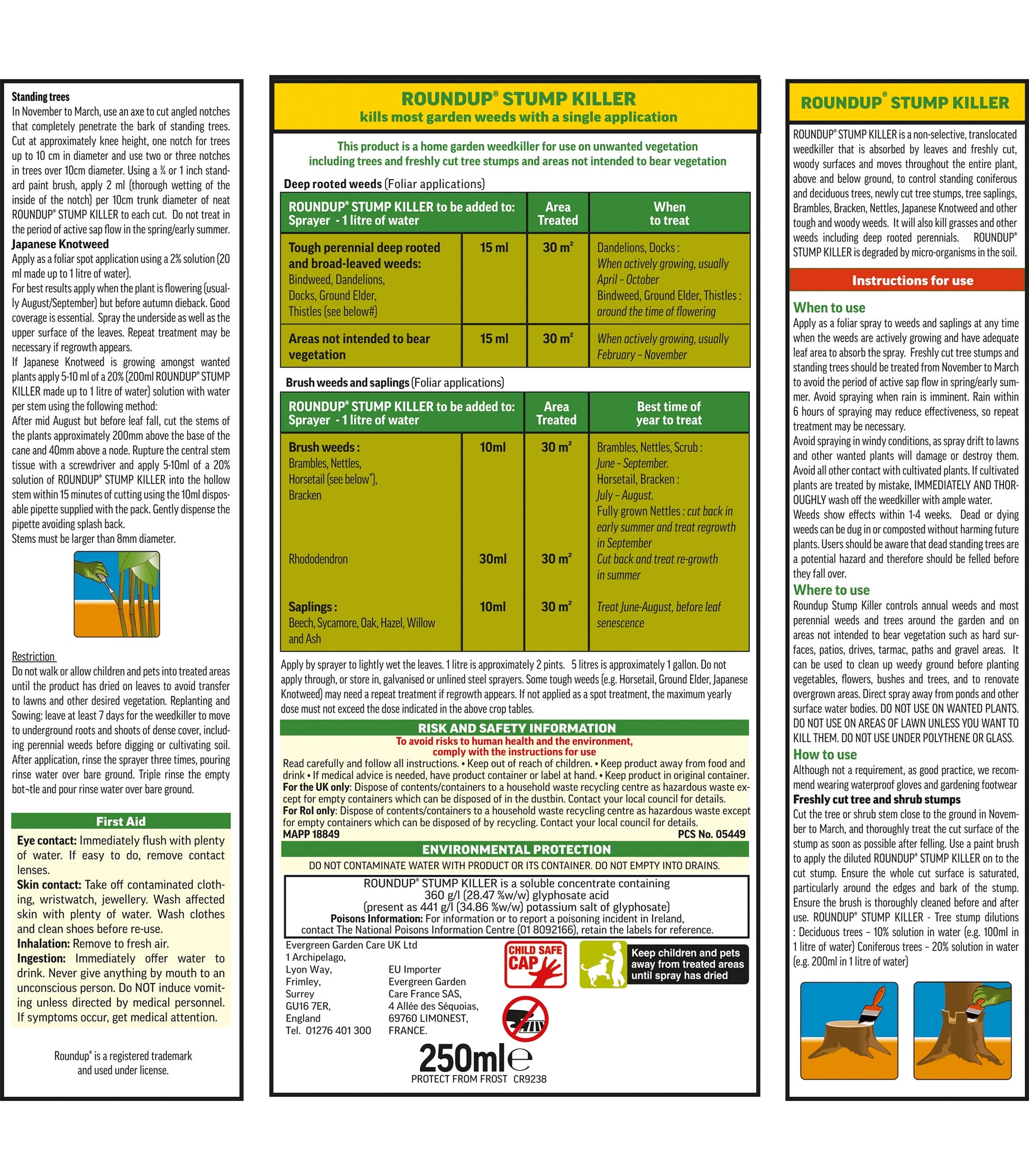 Roundup Tree Stump & Root Killer is a concentrate glyphosate weedkiller that kills tree stumps, ivy, Japanese knotweed, saplings, brambles, and nettles