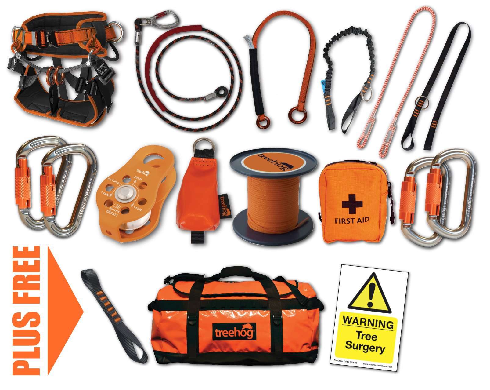Includes: TH7000 tree climbers harness, TH1171 3m Wire Core Flip line, TH118 100cm Cambium Saver. TH1111 bungee strop, TH1113 tool strop, TH1153 eye to eye sling 80cm, THPUL1 fixed pulley, TH1195 220G throw bag, TH1198 throw line 50m, x2 THK002 karabiner, x2 THK006 karabiner, THFA01 first aid kit. Plus Free: TH1160 Cut away strop, warning sign, 70 litre kit bag.