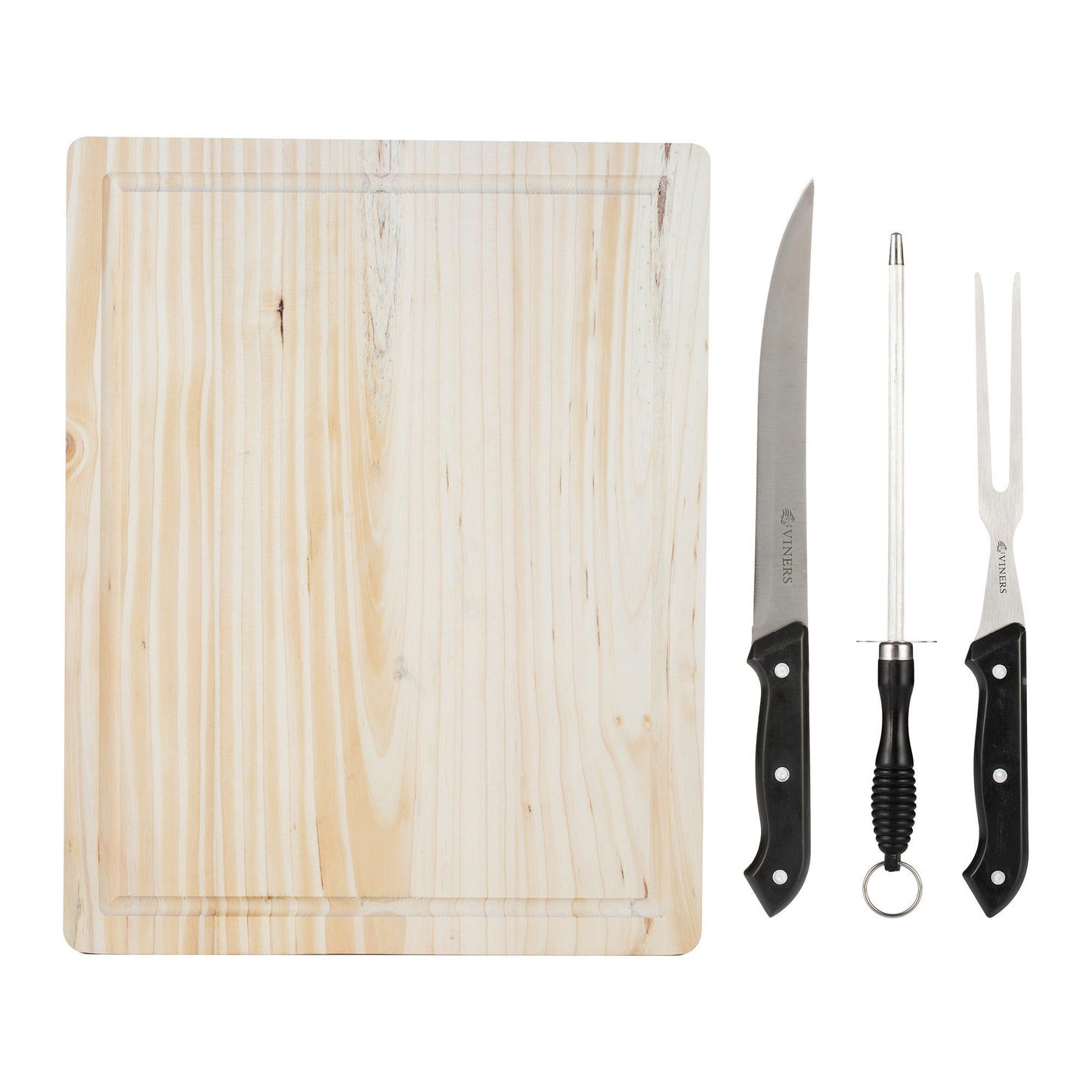 This versatile carving knife and fork set is perfect for vegetable dicing, slicing herbs and cutting meat. Includes 1 x 30cm carving knife, 1 x 15cm meat fork, 1 x 35cm x 28cm pine carving board and 1 x 20cm sharpening rod.