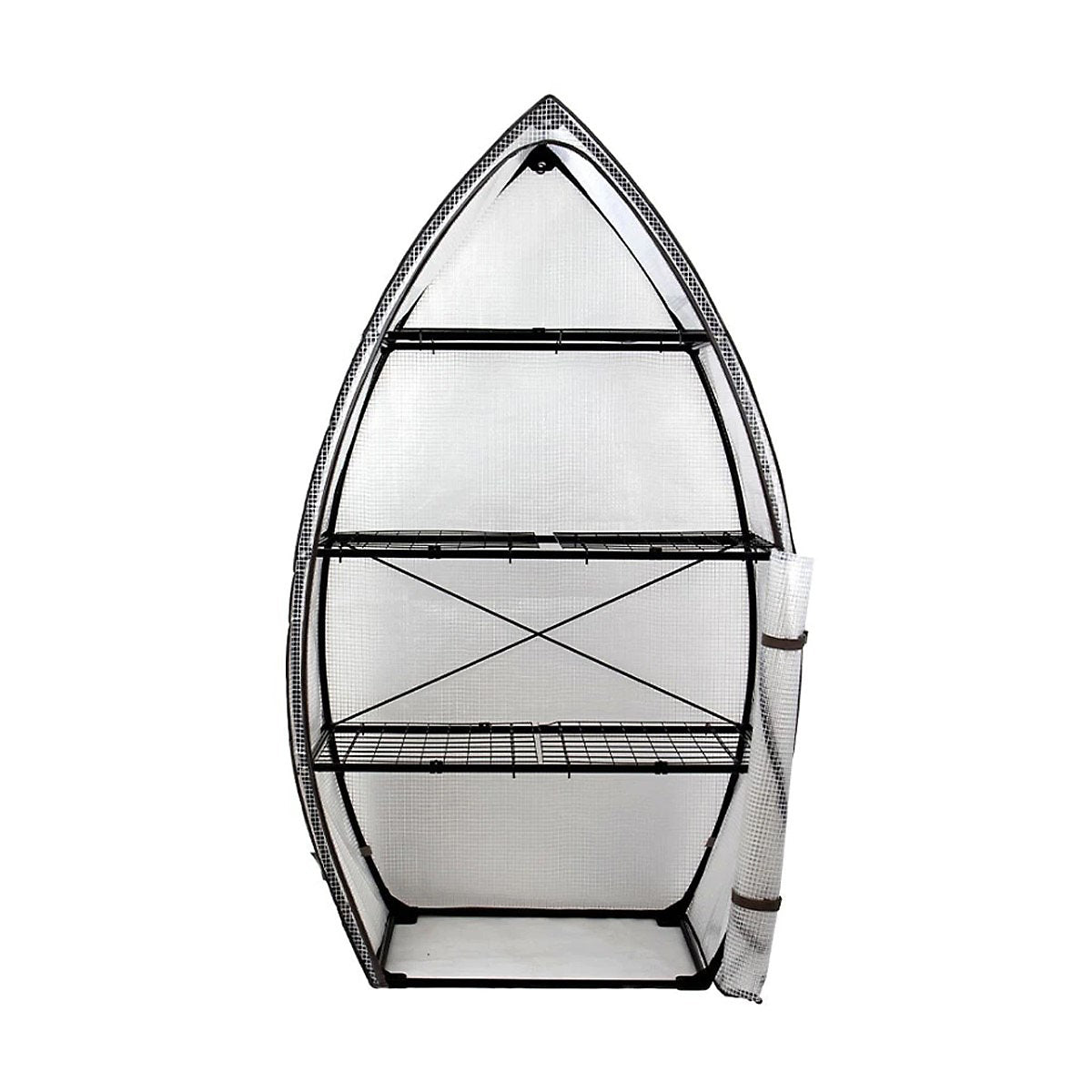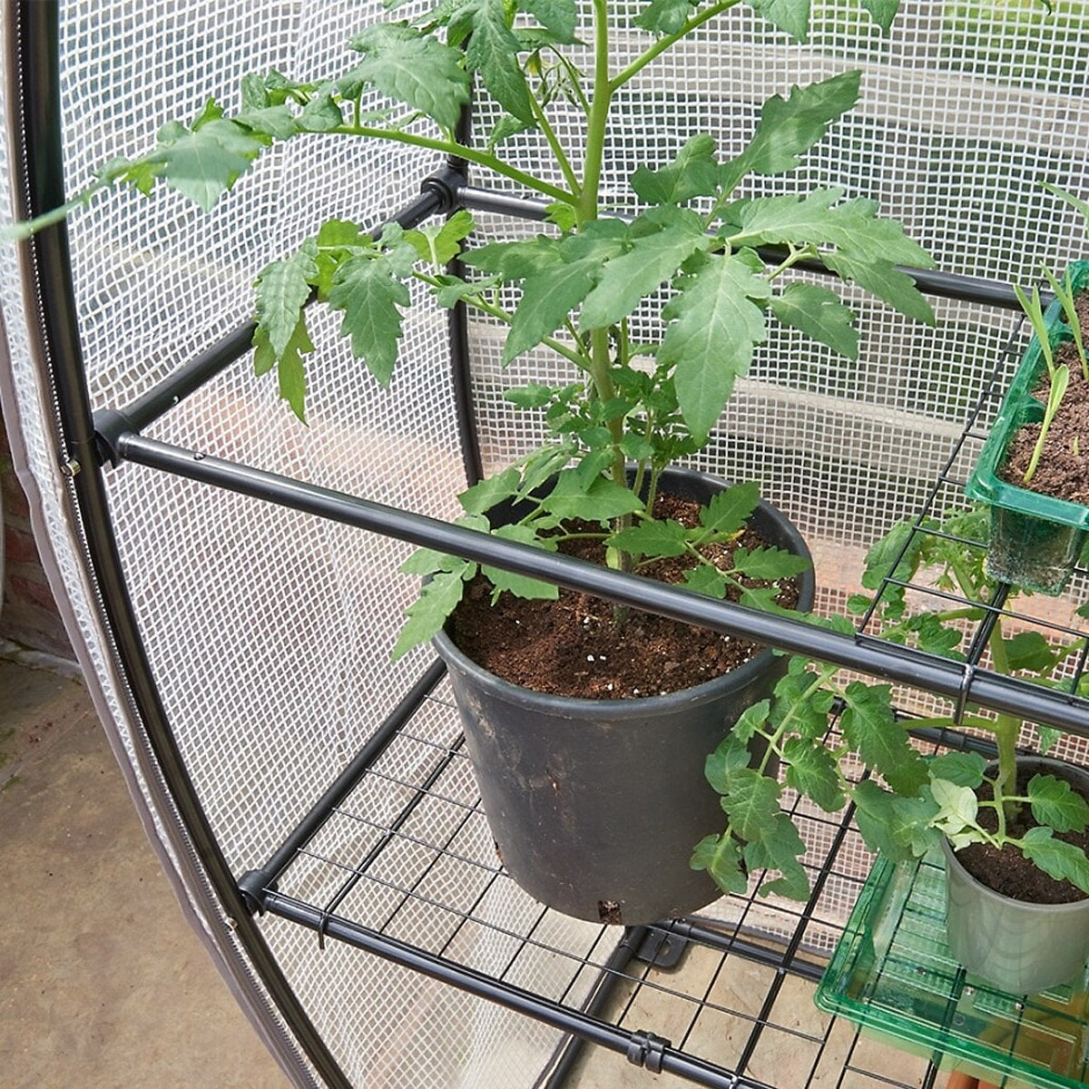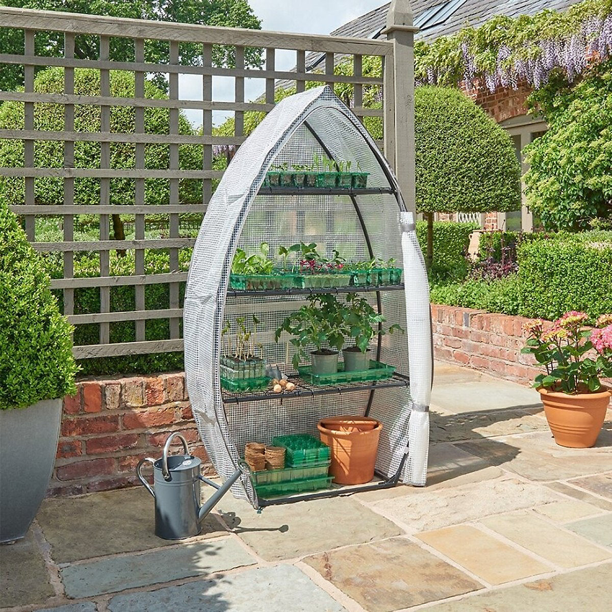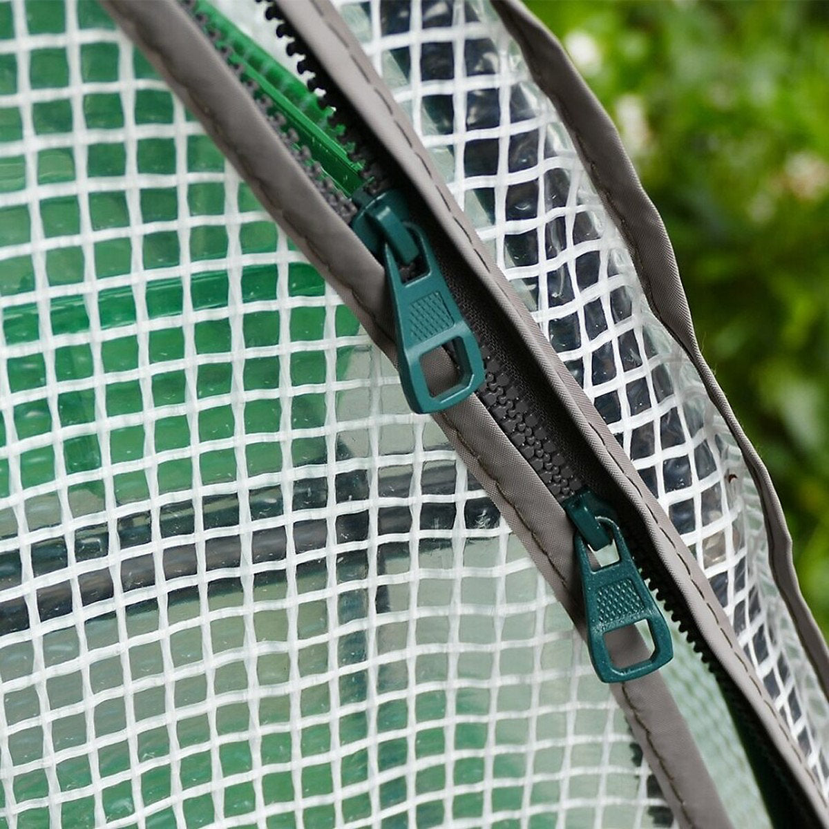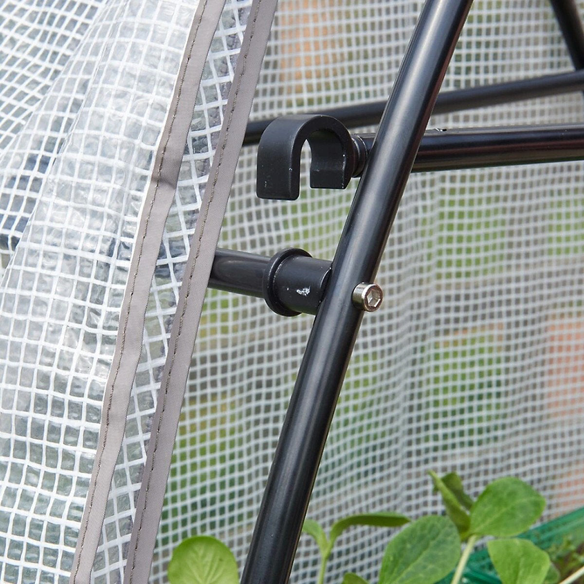 Its unique shape allows easy access and accommodates up to 12 standard seed trays. The sturdy frame, secured with screws for rigidity and additional anchor points at the top and bottom, ensures stability. The UV-treated reinforced cover features buckle clips to hold the door open and twin zips for easy ventilation and access, making it a practical and durable solution for your gardening needs.