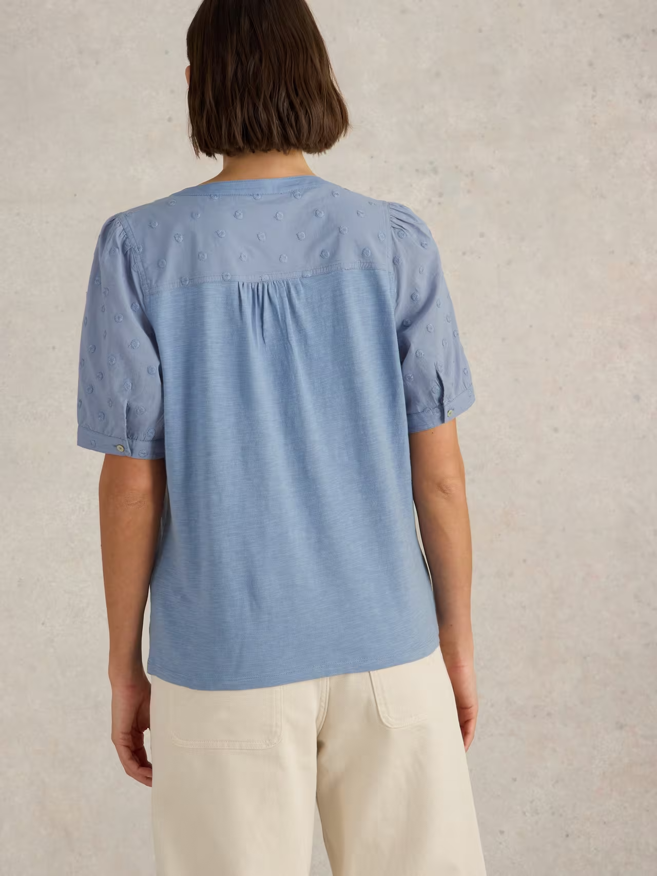 Featuring textured spotty sleeves, this tee adds a touch of elegance to any outfit. Perfect for those days when you want to feel a little fancier, this top is a must-have addition to your wardrobe.