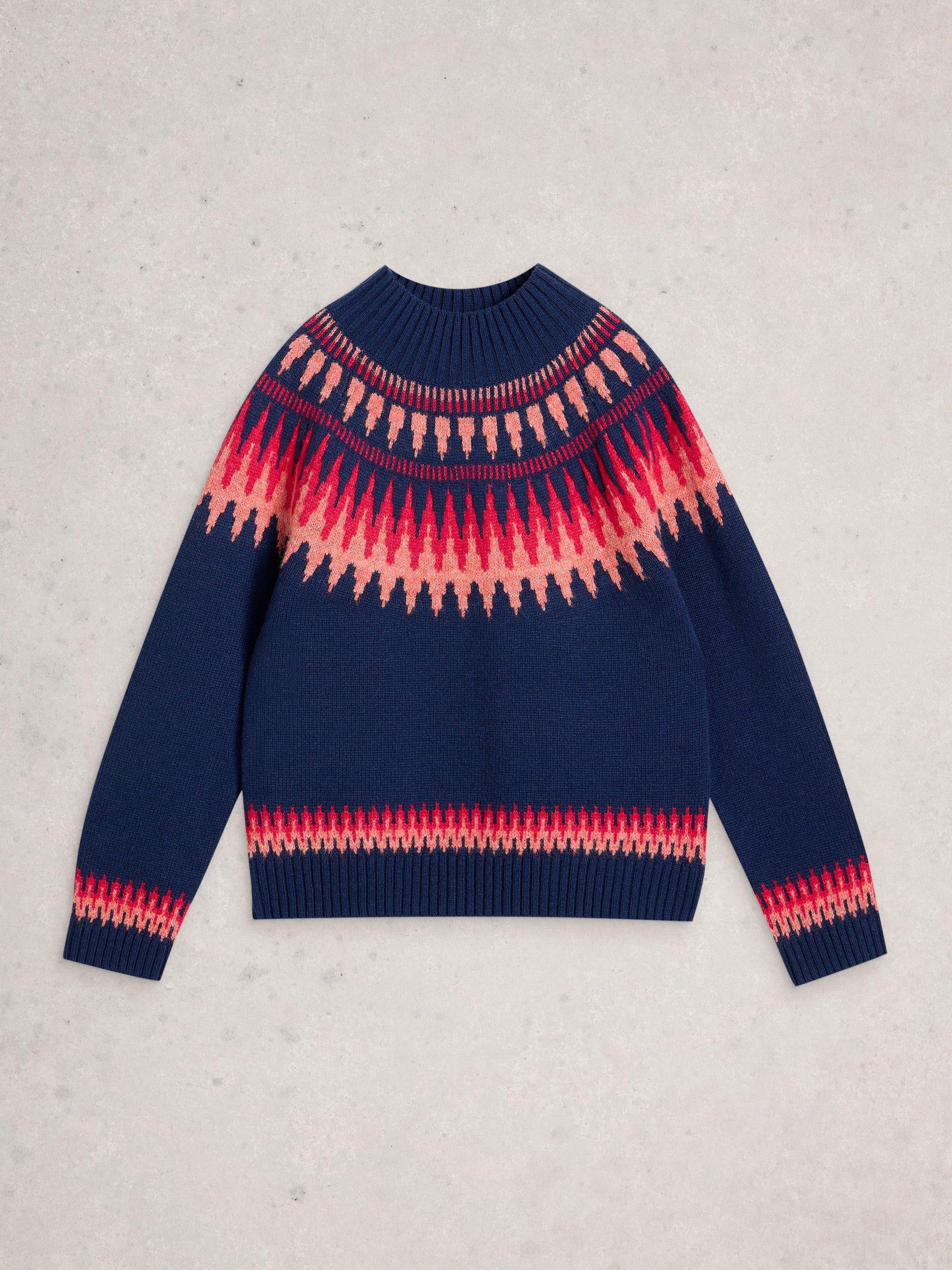 The White Stuff Fiona Fairisle Jumper in Navy Multi features a vibrant fairisle-inspired pattern in striking pink shades around the yoke, cuffs, and hem.