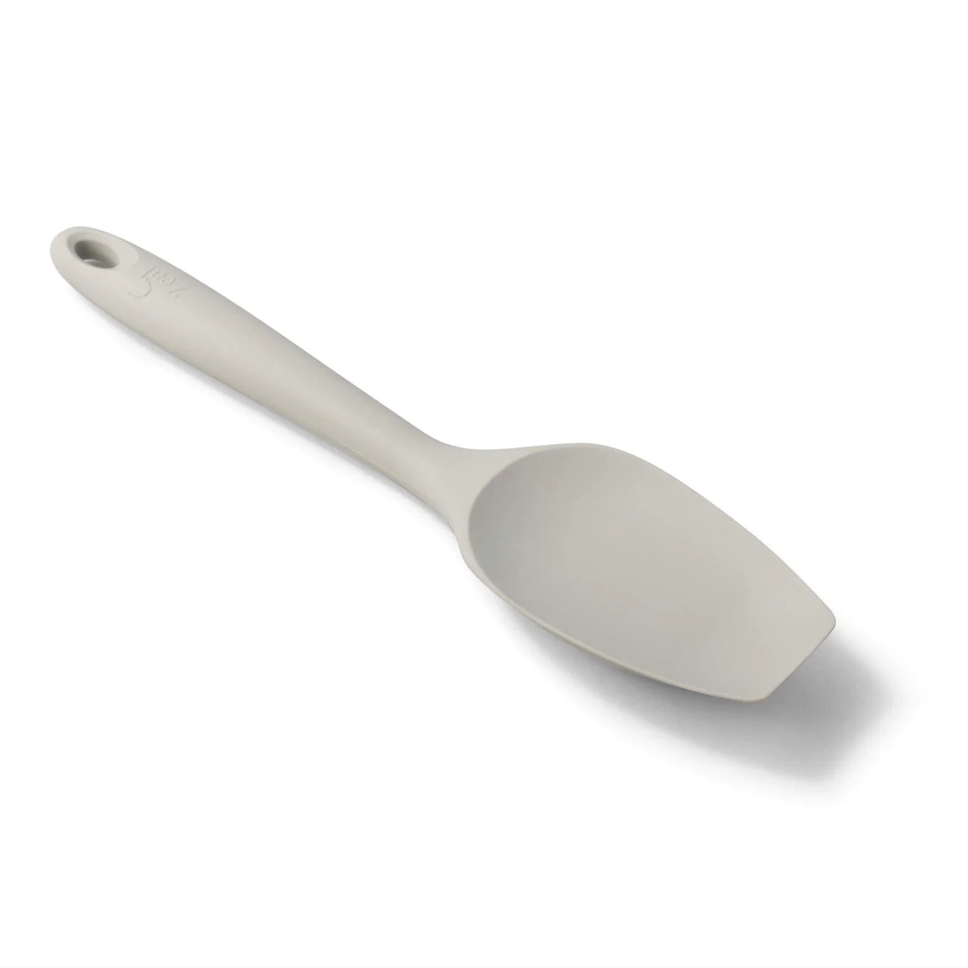 This unique Zeal flat-ended silicone spoon has been designed and developed to optimise the contact between spoon and pan, preventing food from sticking to hot pans during cooking. The long tapered edge of the spoon scrapes not only the bottom of the bowl but also the sides perfectly.